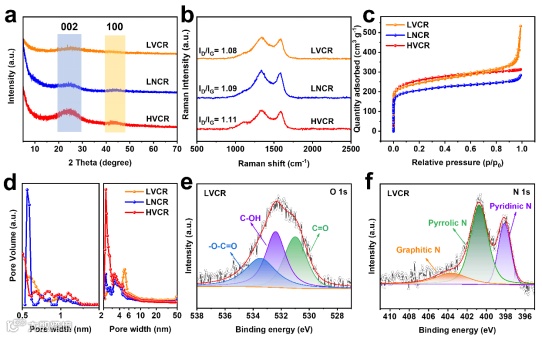 图3. LVCR,LNCR和HVCR的(a)XRD,(b)拉曼光谱和(c)氮吸附-解吸等温线。(d)LVCR、LNCR、HVCR在DFT模式下的PSD曲线。LVCR的(e)O 1s和(f)N 1 s XPS光谱。