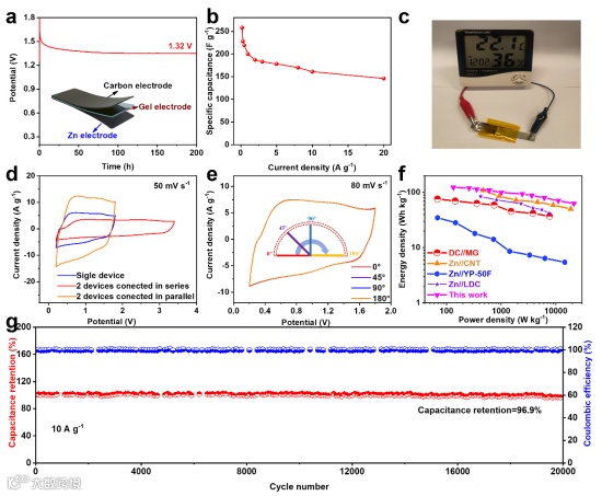 图7. 基于LVCR的准固态ZIC的(a)自放电曲线和(b)倍率性能。(c)准固态ZIC作为电源的电子钟照片。(d)基于LVCR的准固态ZIC串联和并联的CV曲线。(e)基于LVCR的准固态ZIC在不同弯曲角度下的CV曲线。(f)基于LVCR的准固态器件与以往报道的相比较的Ragone图。(g)基于LVCR的准固态ZIC在10 A g-1下的循环性能。
