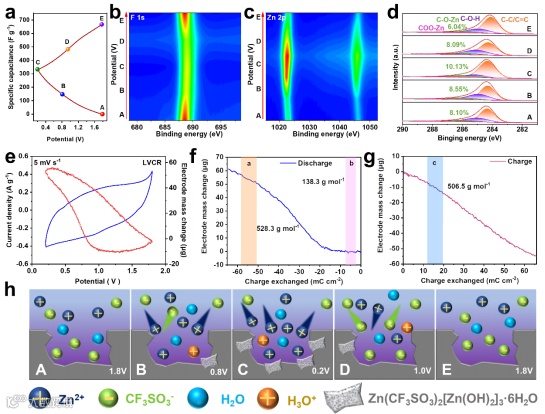 图5.(a)0.3 A g-1下LVCR的GCD曲线并选择不同充放电状态。不同充放电状态下(b)F 1s和(c)Zn 2p XPS二维强度图。(d)不同充放电状态下的高分辨率C 1s XPS光谱。(e)LVCR阴极在5 mV s-1时的CV曲线和相应的质量变化响应。(f)放电和(g)充电过程中电极质量随电荷的变化。(h)1 mol L-1 Zn(CF3SO3)2电解液在LVCR电极上离子吸附/解吸示意图。