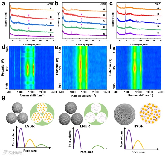 图6. (a)LVCR、(b)LNCR和(c)HVCR阴极在不同充放电状态下的非原位XRD谱图。(d)LVCR、(e)LNCR和(f)HVCR阴极在充放电过程中的原位拉曼光谱。(g)LVCR、LNCR和HVCR的孔隙结构示意图。