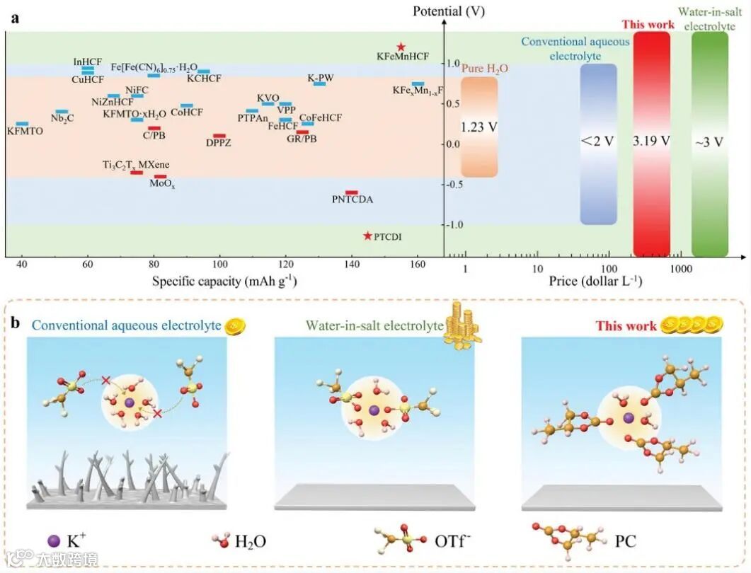 高安全性钾离子电池(HPIBs)因其绿色能源、低成本、高电压、不燃和组装简单而非常有趣。然而,大多数高压HPIBs使用盐包水电解质(WISE),这会导致高粘度等问题,显著降低了HPIBs的性能并增加了成本,从而阻碍了其发展。即使如此,关于HPIBs电解质的研究仍然有限,进一步限制了HPIB的发展。在此,华中科技大学高义华教授&安徽大学岳阳副教授团队开发了一种助溶剂工程电解质(4.0 M KOTf在碳酸丙烯酯(PC)和H2O的体积比为 5.0:1.0),该电解质具有低成本(WISE的1/4)和高性能(45.43 mS cm−1)的特性,不仅通过降低H2O的活性实现了较宽的电化学稳定性窗口,还调节了K+的溶剂化结构。因此,通过助溶剂工程电解质组装的HPIBs表现出88.05 Wh kg−1的高能量密度,并以0.50~10.0 A g−1的速率在很宽的温度范围内(−25~50 ℃)充分运行。该研究为开发高压HPIBs提供了一种有前途的手段。
