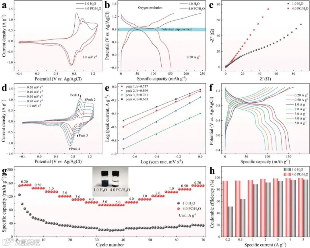 a) 1.0 mV s−1时的CV曲线。b) 0.20 A g−1时的GCD曲线。c) 1.0 H2O电解质和4.0 PC/H2O电解质中KFeMnHCF电极的EIS曲线。d) 0.20~1.0 mV s−1时的CV曲线。e) CV曲线每个峰值处的对数(峰值电流)与对数(扫描速率)的关系图。f) 4.0 PC/H2O电解质中0.20~5.0 A g−1时KFeMnHCF电极的GCD曲线。g) KFeMnHCF电极的倍率性能。插图是将KFeMnHCF粉末浸泡在1.0 H2O电解质和4.0 PC/H2O电解质中5天后。h) 不同电流密度下的库仑效率。