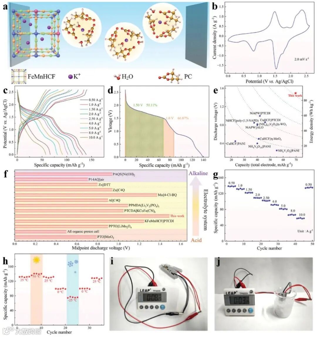 a) 工作原理,b)2.0 mV s−1时的CV曲线,基于阴极质量的HPIB在c) 0.50~10.0 A g−1下的GCD曲线和d) 0.50 A g−1下的放电曲线。e) 将全电池的平均放电电压、容量(基于两个电极的总有效质量)和能量密度与其他报道的使用水性电解质的高安全性电池进行比较。f) HPIB的中点放电电压与具有酸性、温和性和碱性电解质的不同高安全性电池进行比较。g) HPIB的速率性能。h) HPIB在−25~50 ℃下性能。HPIBs在i) 室温和j) 低温下为计数器供电。