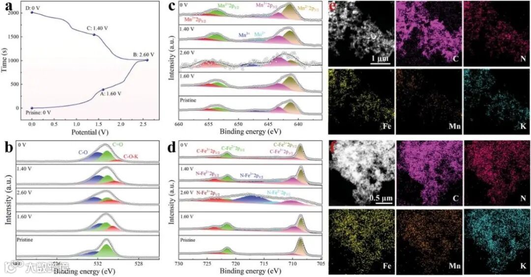 a) 0.50 A g−1时的GCD曲线,其中在GCD曲线的标记点对KFeMnHCF阴极和PTCDI阳极进行了各种非原位表征。b) PTCDI阳极的O 1s XPS光谱。c) 不同充电/放电态下KFeMnHCF阴极的Mn 2p和Fe 2p XPS光谱。KFeMnHCF阴极在e) 充电和f) 放电状态下的TEM图像和相应的元素映射。