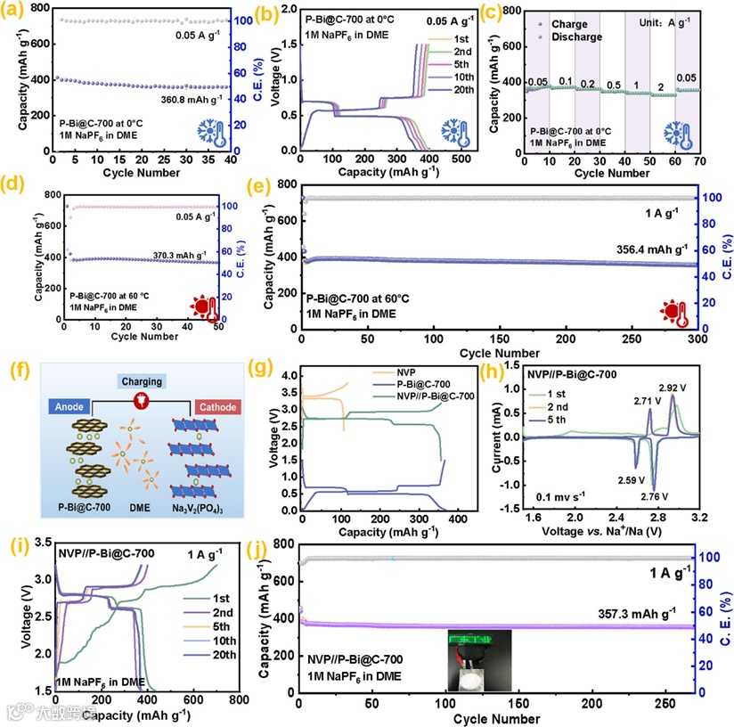 图5. P-Bi@C-700在0°C和60°C下的Na+储存性能以及全电池性能
