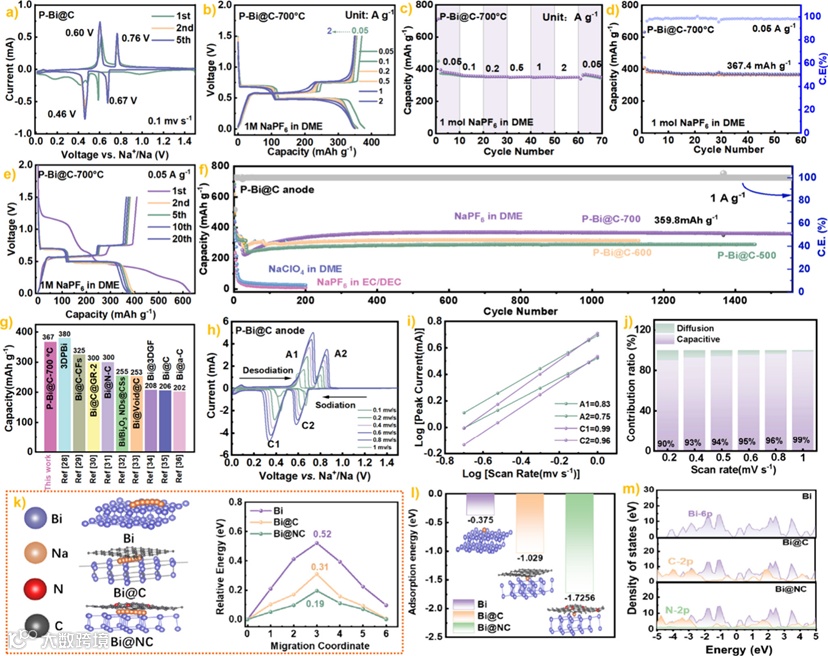图2. P-Bi@C-700的Na+储存性能和动力学分析