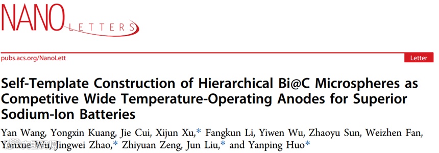 高性能宽温域钠离子电池负极材料设计:基于自模板构筑的多级结构Bi@C微球