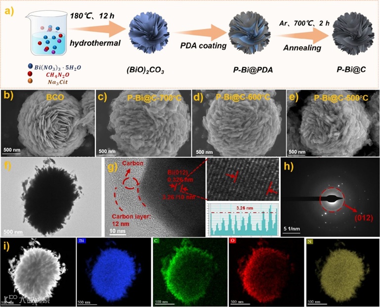 要点一:构建PDA衍生的氮掺杂碳层包覆的由纳米片自组装的多级P-Bi@C微米球