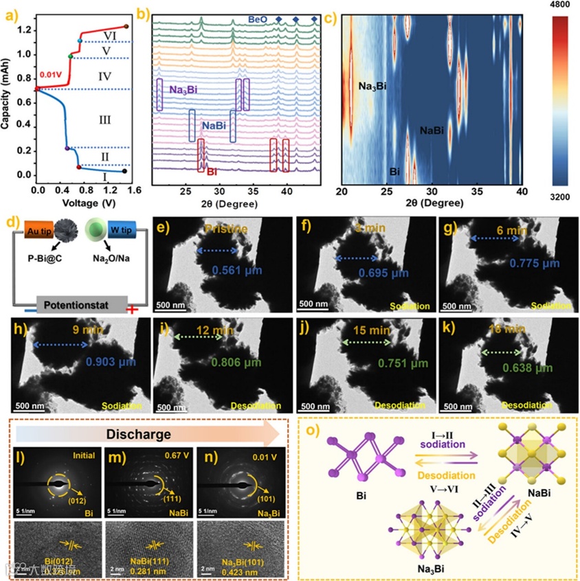 通过初始的充放电曲线(GCD)(图3a)、原位XRD(图3b-c)、原位TEM(图3d-k)、非原位SAED和相应的HRTEM图谱(图3l-n)的结果清楚地证实了P-Bi@C-700负极的可逆合金化反应。因此, P-Bi@C-700可逆合金化反应机理可归结为如下: