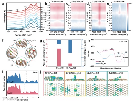 在初始状态下,Cl-FeSA/NC没有观察到明显的信号,当电位降低至1.0 V(接近Cl-FeSA/NC的氧还原反应(ORR)起始电位)时,出现了一个位于约1084 cm−1的峰,对应于*O2−中间体。随着施加电位的降低,*O2−中间体的信号逐渐增强,同时在275 cm−1和711 cm−1处出现两个新峰,分别归因于M-OH−和*OH中间体。*O2−中间体的大量生成能够快速转换为M-OH⁻和*OH,从而加速的ORR动力学过程。而对于FeSA/NC,即使在0.4 V的电位下也仅观察到微弱的*O2−中间体信号,并且在原位表征过程中未观察到M-OH⁻和*OH中间体。FeSA/NC中*O2−中间体含量低的原因是在反应过程中海水中的Cl⁻吸附在FeSA/NC的活性位点上,阻止了氧气接近活性中心,并抑制了*O2−中间体的生成过程。相比之下,Cl-FeSA/NC中Fe位点轴向配位的Cl⁻原位构建了一个局部带负电荷的界面,该界面抑制了Cl⁻在活性位点上的吸附,从而确保了*O2−中间体的形成以及快速的*O2−质子化动力学过程,进而表现出良好的ORR活性和稳定性。