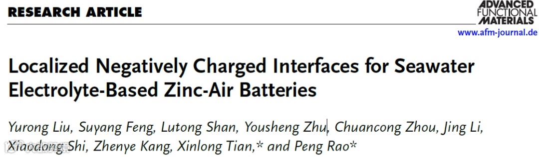 近日,海南大学田新龙教授与饶鹏副研究员在Advanced Functional Materials上发表题为“Localized Negatively Charged Interfaces for Seawater Electrolyte-Based Zinc-Air Battery”的研究工作。该工作通过在Fe单原子轴向位点引入高电负性Cl⁻,优化Fe位点电荷分布,构建局域负电荷界面以抑制Cl⁻吸附,显著提升ORR活性与稳定性。
