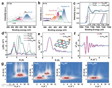 首先在合成ZIF-8G过程中原位掺杂Fe制得Fe/ZIF-8前驱体。随后,将Fe/ZIF-8与NaCl和KCl溶液均匀混合,再经过高温热解,最终制得Cl-FeSA/NC。透射电镜显示Cl-FeSA/NC保持了ZIF-8的菱形十二面体结构,且未观察到金属纳米颗粒或团簇。球差电镜揭示了Fe物种以原子级分散的形式负载在碳载体上。EDS图像进一步证实了Fe和Cl元素在碳载体上的均匀分布。XPS数据揭示了Cl-FeSA/NC中Cl与Fe位点的配位关系,同时Fe的氧化态在引入轴向配位的Cl-后几乎未发生变化。此外, XAFS数据揭示了Cl-FeSA/NC和FeSA/NC中的Fe物种价在0-+3价之间,而Cl-FeSA/NC的Fe价态略低于FeSA/NC,这可能与Cl的轴向配位调节了Fe物种的电子密度有关。EXAFS光谱的傅里叶变换结果进一步证实了Cl-FeSA/NC中Fe物种以单原子形式存在,且每个Fe原子与四个N原子和一个轴向Cl原子配位。