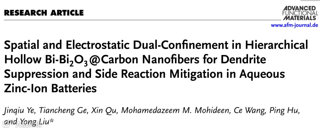 水系锌离子电池(AZIBs)作为一种绿色、安全、低成本的能源存储技术,近年来受到广泛关注。然而,在多次充放电过程中,锌枝晶的生成和副反应是制约其长循环寿命和高效能的主要瓶颈。近日,北京化工大学刘勇教授团队联合吉林大学王策教授和清华大学胡平教授,在《Advanced Functional Materials》期刊上发表题为“Spatial and Electrostatic Dual-Confinement in Hierarchical Hollow Bi-Bi₂O₃@Carbon Nanofibers for Dendrite Suppression and Side Reaction Mitigation in Aqueous Zinc-Ion Batteries”的研究论文,报道了一种新型的水系锌离子电池阳极材料——负载Bi-Bi₂O₃的碳纳米纤维(Bi-Bi₂O₃@CNF)复合材料,该材料具备分级中空结构和表面沟槽,其在抑制锌枝晶生长、减少副反应和缓解电池极化方面表现出优异的性能。