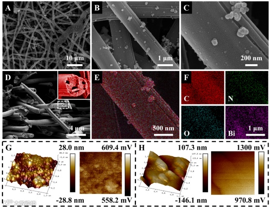 图1. Bi-Bi₂O₃@CNF的形貌和结构特征:不同放大倍数下的表面形貌(A-C)、截面形貌(D)、纤维表面的元素分布图(E-F)、原子力显微镜(AFM)和开尔文探针力显微镜图像,Bi-Bi₂O₃@CNF(G)和锌片(H)。