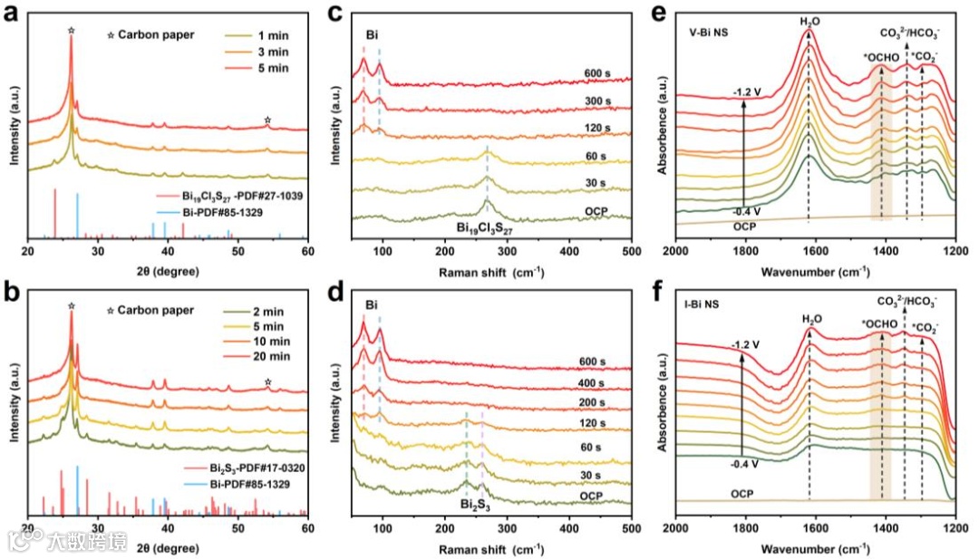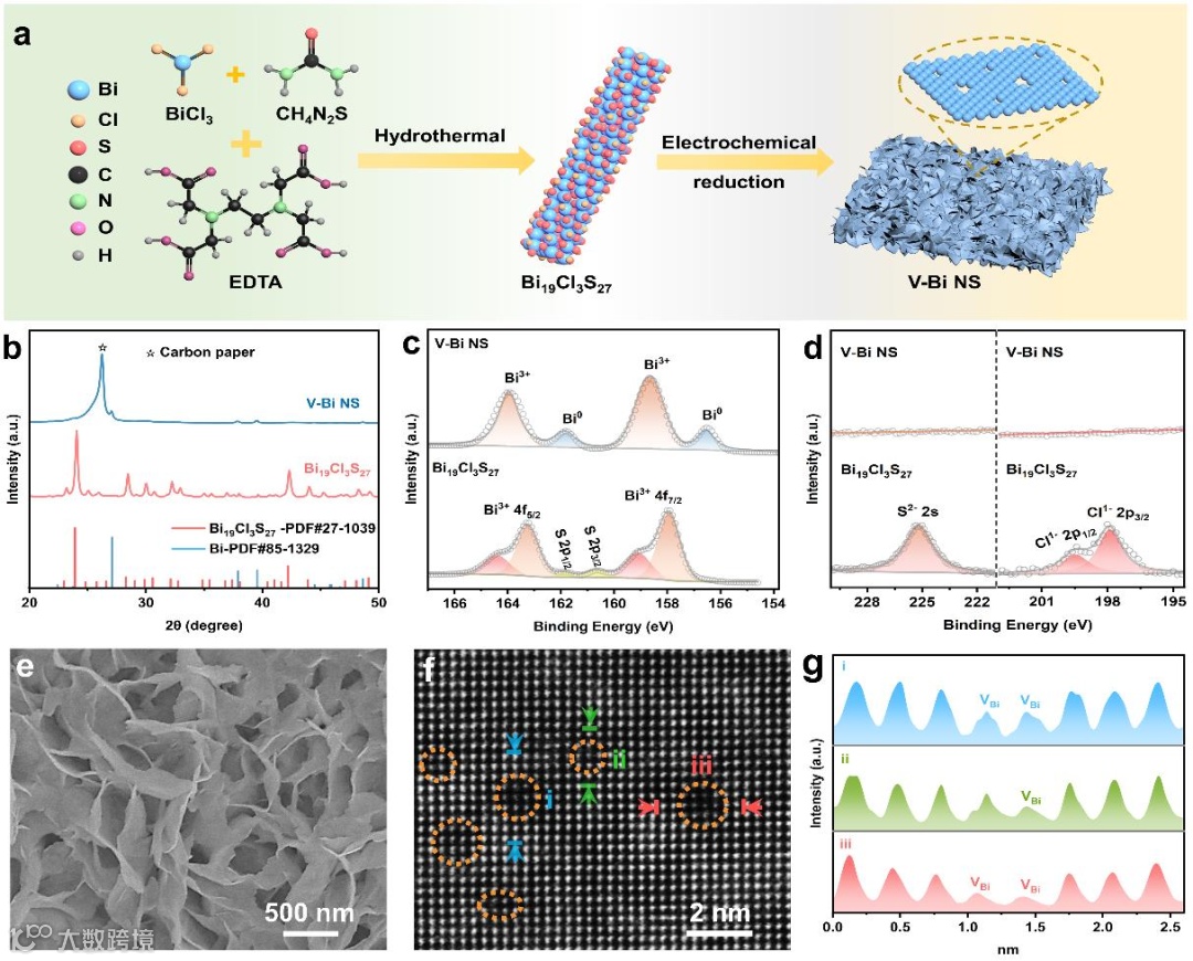 图2. Bi19Cl3S27前驱体和V-Bi NS催化剂的形态和结构表征。