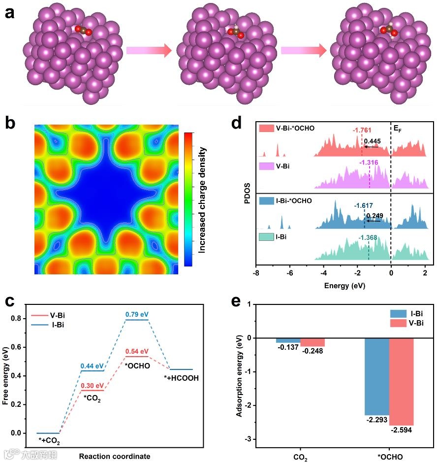 原位红外观察显示,相较于I-Bi NS,V-Bi NS对*OCHO和CO2的吸附效果更为显著。DFT计算表明,铋空位处于富电子聚集态,降低了CO2到*CO2-自由基的活化能和甲酸生成的决速步能垒,有效提高了CO2生成甲酸的转化效率。