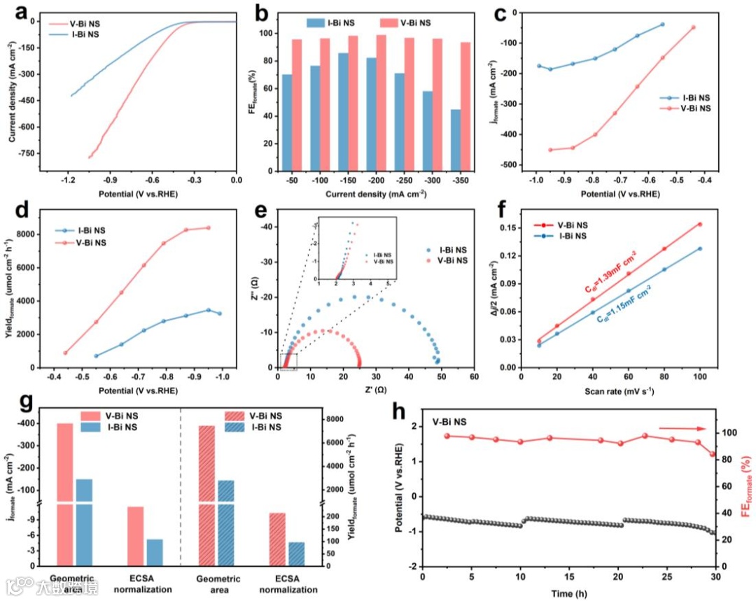图4. V-Bi NS和I-Bi NS的电催化性能。