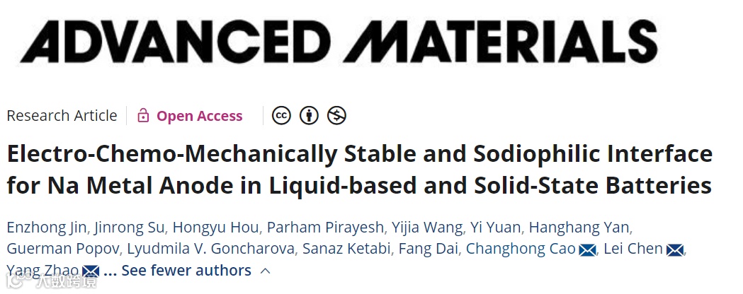 近日,来自加拿大西安大略大学的赵阳教授和加拿大麦吉尔大学的曹长宏教授,美国密歇根大学−迪尔伯恩分校的陈磊教授合作,在国际知名期刊Advanced Materials上发表题为“Electro-Chemo-Mechanically Stable and Sodiophilic Interface for Na Metal Anode in Liquid-based and Solid-State Batteries”的文章。该文章提出了一种金属掺杂的成分可调、具有亲钠位点并且具有良好的机械性能的纳米级聚合物薄膜。该薄膜可有效提供钠金属负极界面的化学/电化学和机械稳定性。