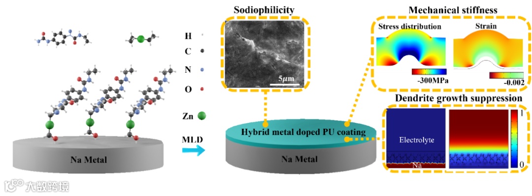 图1. 金属掺杂聚合物纳米薄膜生长的示意图及其具有的优势:具有亲钠位点、具有良好的机械性能且显著抑制枝晶生长。