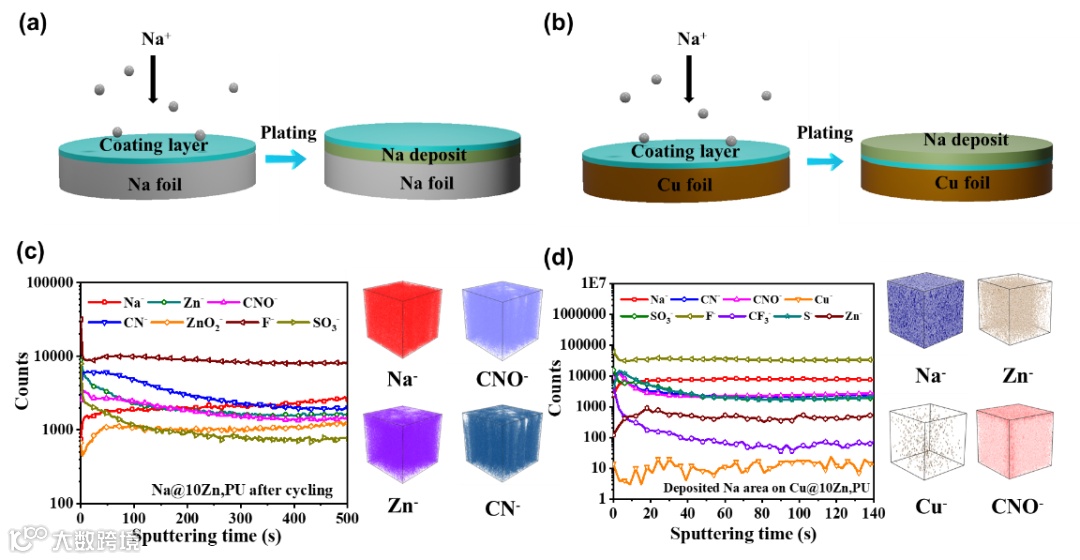 图2. a, b) 不同基底上钠沉积的示意图;c) Na@10Zn,PU经过电化学循环后ToF-SIMS的表征结果。d) Cu@10Zn,PU在电流密度为0.5 mA cm-2,面积容量为0.5 mAh cm-2条件下的沉积的钠区域的ToF-SIMS表征结果。
