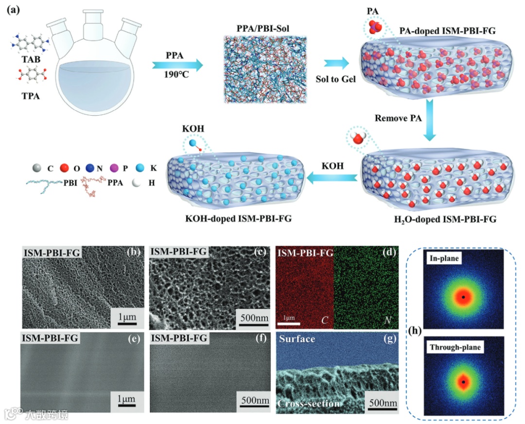为开发具有互连多孔结构和优化离子通道的高性能 ISM,研究人员实施了一种简单的方法来制造自支撑凝胶形态的无阳离子基团的PBI 离子溶剂化膜 (ISM-PBI-FG)。该过程涉及使用 PPA 作为溶剂进行缩聚,将对位PBI/PPA 溶液直接铸造,以及通过热 PPA 水解为冷 PA的过程来诱导溶液到凝胶膜的转变。冷冻 SEM 横截面图像显示平均孔径为 37 nm。这种独特的内部结构具有多种优势,包括为 KOH 电解质储存提供充足的空间、增强可电离苯并咪唑位点的利用率以及建立高效离子传输的连续途径。2D SAXS 图像表明 H₂O 掺杂 ISM-PBI-FG 膜的各向异性较弱,该图像在in-plane和through-plane方向上都显示出较小的取向性。