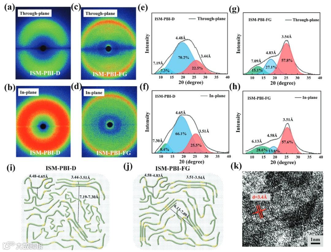 图2.ISM-PBI-D膜与ISM-PBI-FG膜的WAXS对比及ISM-PBI-FG膜的TEM图