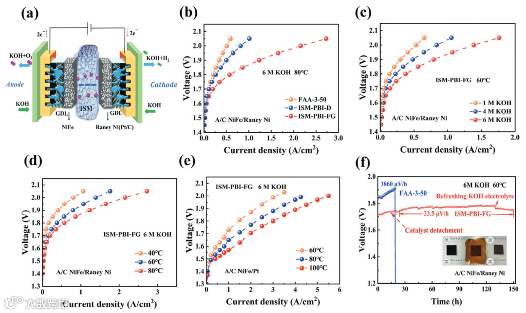 图5.自支撑凝胶形态的ISM-PBI-FG膜在碱性电解槽输出性能与长期稳定性