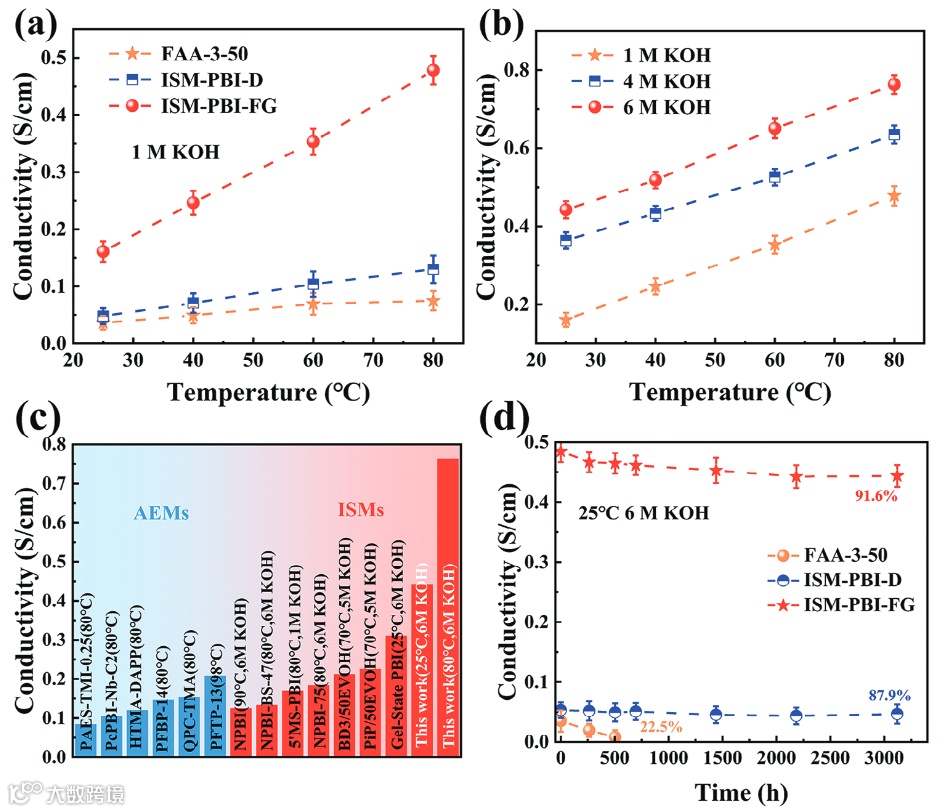 离子传导率是 ISM 材料的关键性能指标,因为它直接影响电解槽的效率。在评估的 KOH 掺杂膜中,ISM-PBI-FG 膜具有多孔结构以及大大增加的 KOH 和水吸收率,表现出最高的离子电导率。正如预期的那样,由于离子传输位点的可用性更高,KOH 浓度的增加导致更高的电导率。此外,温度的升高进一步促进了离子迁移,从而产生了更高的电导率水平。值得注意的是,当 ISM-PBI-FG 膜在 80°C 下掺杂 6M KOH 时,达到了 763 mS cm-1 的出色电导率。ISM-PBI-FG膜的 3D 多孔网络及其互连的纳米通道确保了 OH- 离子能够平稳自由地迁移,与它们在 KOH 溶液中的行为非常相似。