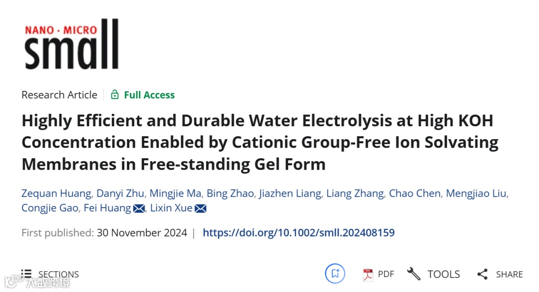 基于此,浙江工业大学的黄菲教授与温州大学的薛立新研究员,在国际知名的期刊 Small上发表题为“Highly Efficient and Durable Water Electrolysis at High KOH Concentration Enabled by Cationic Group-Free Ion Solvating Membranes in Free-standing Gel Form”的研究论文。该工作提出了一类新型的独立式凝胶形式的无阳离子基团的离子溶剂化膜 (ISM-PBI-FG) 用于高效和耐用的碱性水电解。该膜以凝胶形态存在,通过溶胶-凝胶转变过程后经KOH吸收制备而成。与传统的 AEM 和PBI基 ISM 相比,ISM-PBI-FG 膜具有多孔的内部结构和致密的外表面,为碱性电解质的吸收提供了更大的体积,并为离子传输创造了纳米级通道。ISM-PBI-FG膜是由纠缠的聚苯并咪唑(PBI)纳米纤维组成的3D多孔微观结构,实现了89%的孔隙率,使其能够吸收极高的碱液(在6 M KOH中为346%)并展现出卓越的离子传导性(在80°C时为763 mS cm⁻¹)。这一概念的可行性通过 AWE 测试得到了验证,其中使用 NiFe/Raney Ni(不含 PGM)和 NiFe/Pt/C (PGM) 催化剂组合,在 2.0V 下电流密度分别达 2.2 A cm-² 和 5.5 A cm-²,实现了优异的水电解性能。本研究工作得到国家自然科学基金委基金项目(22209147)和中国工程院院士咨询项目(2022-DZ-08)的资助完成。