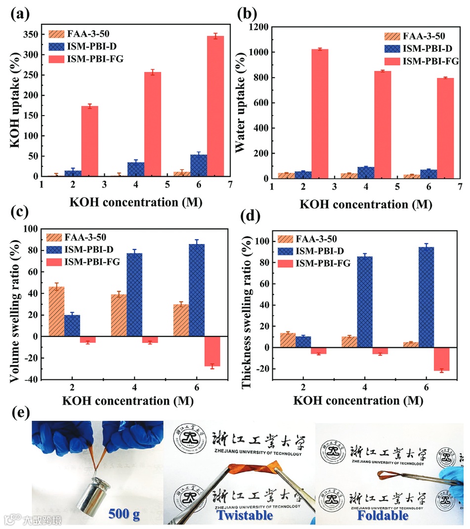 接触碱性溶液后,PBI-ISM的苯并咪唑基团发生去质子化,形成由 PBI、H2O 和 KOH 组成的三元系统,有助于 OH-离子在膜内的运输。得益于其高度多孔的结构,ISM-PBI-FG 膜吸收的 KOH 是 ISM-PBI-D 膜的 6 至 12 倍。随着 KOH 浓度从 2 M 增加到 6 M,ISM-PBI-FG 膜的 KOH 吸收从 173% 显著上升到 346%,远超市售 FAA-3-50 膜(6 M KOH 时为 11.0%)和 ISM-PBI-D 膜(6 M KOH 时为 53.5%)。这种 KOH 掺杂膜还显示出能够承受 500 g 的负载,同时保持柔韧性,其可折叠性和可扭曲性证明了这一点。