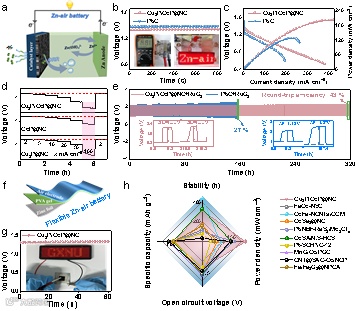 图7. 全固态柔性和液态锌-空气电池的原理图和性能表征。
