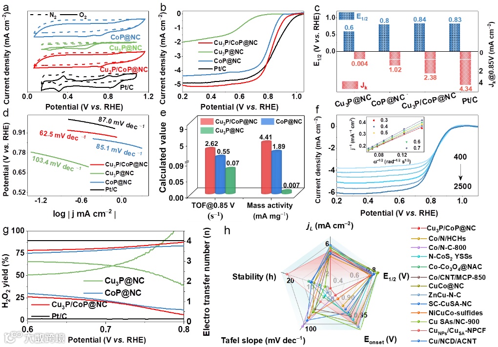得益于结构优势,复合材料在碱性介质中呈现出比单一组分催化剂更加优异的半波电势、极限电流密度、动力学电流密度、质量活性和周转频率值(TOF)。循环伏安图曲线(CV)和线性扫描伏安曲线(LSV)可直观的观察到CoP@NC的电催化活性优于Cu3P@NC,这说明在氧还原过程中Co物种作为主要的活性位点。在Cu3P/CoP@NC不同转速的LSV中,极限电流密度随着转速的增大而增加,表明反应过程具有一阶反应动力学特征,通过Koutecky-Levich方程和旋转环盘电极技术计算的的电子转移数接近4,即在ORR过程中,吸附的氧气(O2)可以通过四电子途径还原成水(H2O),为其在能源转换设备中的应用奠定基础。