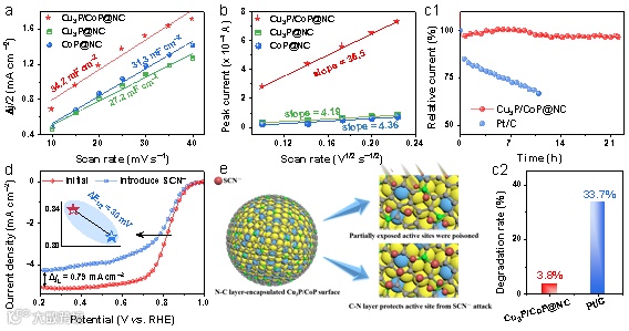 计算非法拉第区域的双电层电容(Cdl)可以评估催化剂的电化学活性比表面积(ECSA)。Cu3P/CoP@NC具有高的Cdl值,说明其形成了具有更多暴露活性位点的多相结构,不同组分间可以相互促进,提高整体催化性能。由于石墨烯层的封装减缓了电化学过程中金属粒子的团聚和腐蚀,Cu3P/CoP@NC在长达22小时的电流-时间测试过程中电流密度的衰减率仅为3.8%,展现了优异的长期稳定性。硫氰根离子(SCN‒)易于多种金属形成络合物,因此可作为区分活性中心的探针。在含有SCN‒离子的电解液中,暴露的金属位点会被SCN‒占据,阻止该位点对氧气的吸附,因此催化剂出现失活现象,这说明金属物种是ORR反应的活性中心。