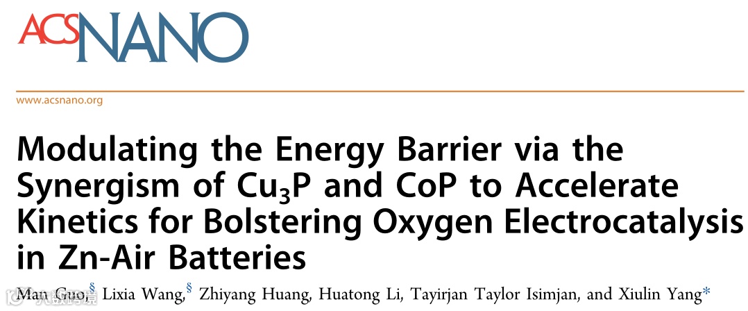 近日,来自广西师范大学的杨秀林教授在国际知名期刊ACS nano上发表题为“Modulating the Energy Barrier via the Synergism of Cu3Pand CoP to Accelerate Kinetics for Bolstering Oxygen Electrocatalysis in Zn-Air Batteries”的研究性论文。该研究通过密度泛函理论计算分析了在碱性介质中Cu3P/CoP@NC催化剂ORR活性增强的原因,解释Cu物种的引入优化了Co位点的电子结构,使其具有合适的反键能态,从而优化中间体吸附力,降低反应能垒并加快反应动力学, 最终使锌-空气电池呈现出良好的功率密度和稳定性。该研究为优化下一代能源转换装置的正极材料提供了理论指导,具有一定的应用潜力。