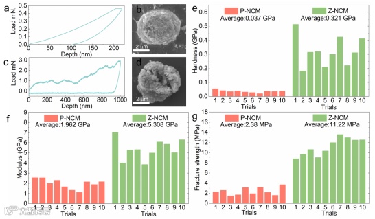 图 4. 使用 (a, b) Berkovich 压头 (c, d) 平冲头压头获得的二次颗粒的压痕和压痕后 SEM 图像的载荷-位移曲线。P-NCM 和 Z-NCM 的 (e) 硬度、(f) 模量和 (g) 断裂强度。