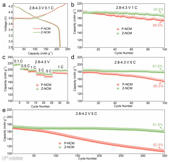 P-NCM 和 Z-NCM 在 0.1 C 下表现出非常高的放电容量(216.2 mAh g-1 vs 213.0 mAh g-1)。Z-NCM 材料在 100 次循环后的容量保持率为 95.6%,远高于 P-NCM(88.5%)。即使在 5 C 的电流密度下,Z-NCM 也能释放超过 180 mAh g-1 的极高容量。在高倍率电流下的循环稳定性方面(图 5d),Z-NCM 在 5 C 下表现出更为出色的容量保持率,100周后为 97.6%,甚至高于 1 C 下循环的容量保持率。相比之下,P-NCM 在 5 C 下经过 100 次循环后的循环稳定性恶化,仅保留 86.5% 的容量。Z-NCM 提高的高倍率循环稳定性可归因于其较小的体积变化和较高的机械刚度,这有效地保护了 Z-NCM 不会在快速充电下因内应力而开裂。全电池测试表明,在 5C 下经过 350 次循环后,Z-NCM 的容量保持率高达 91.8%,而 P-NCM 的容量迅速下降,仅保持 62.5% 的保持率。以上电化学测试证实Z-NCM具有优异的快速充电能力和循环稳定性。