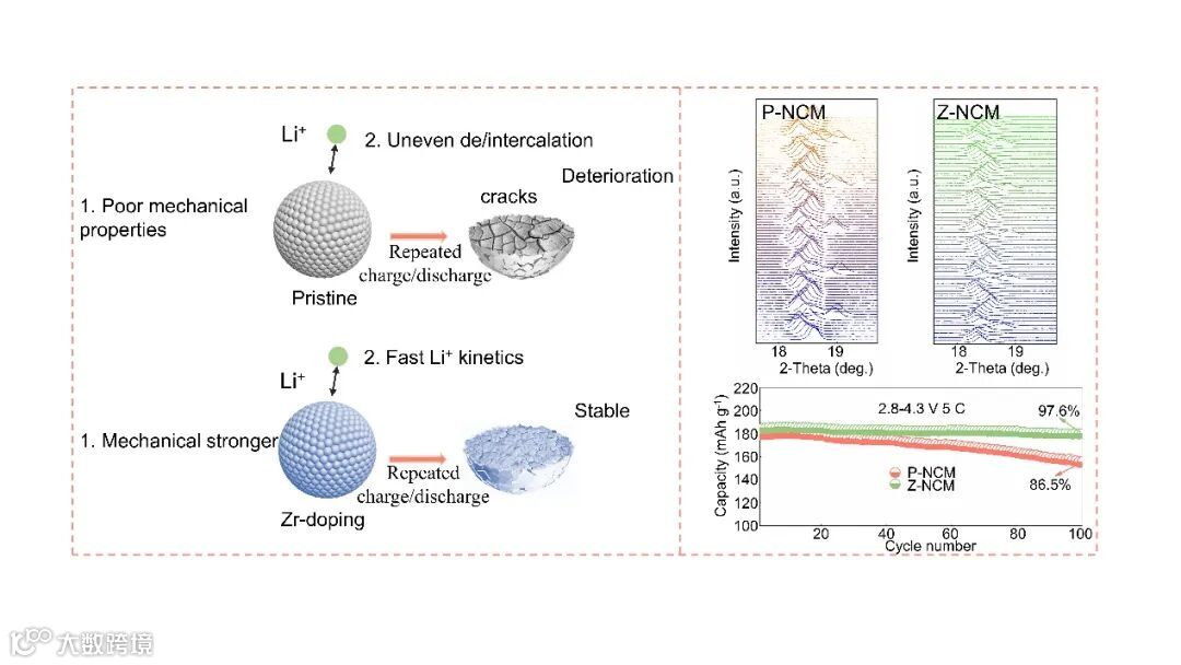 图1. Zr 掺杂提升富镍正极材料循环性能示意图。