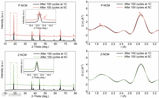 图 6. (a) P-NCM 和 (b) Z-NCM 在 1 C 和 5 C 下循环 100 次后的 XRD 图谱比较。(c) P-NCM 和 (d) Z-NCM 在 1 C 和 5 C 电流密度下循环 100 次后的 PDF 图谱比较。