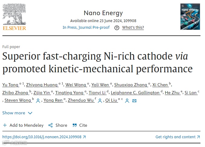 近日,来自香港城市大学的刘奇,Steven Wang教授以及东莞散裂中子源吴桢舵教授合作,在国际知名期刊Nano Energy上发表题为“Superior fast-charging Ni-rich cathode via promoted kinetic-mechanical performance”的文章。该项工作研究了Zr掺杂对于高镍正极材料的快充性能的影响,同时探讨了正极材料的机械力学性质。