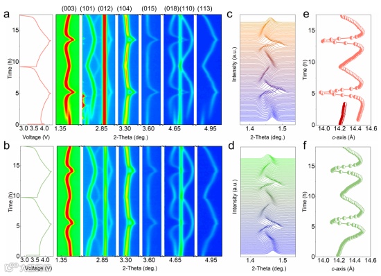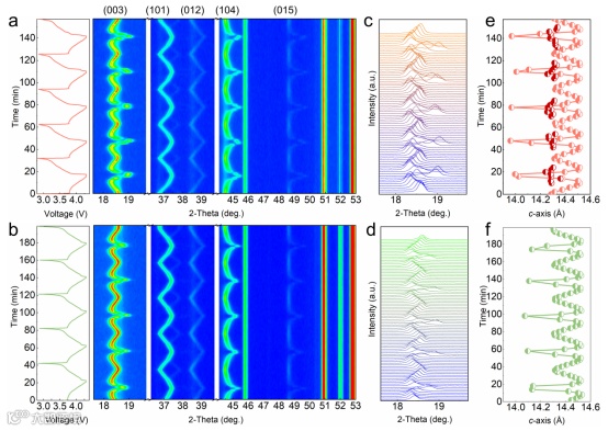图 3. 3 C 倍率电流下富镍正极材料的结构演变。原位 XRD 图案以及 (a) P-NCM 和 (b) Z-NCM 的充放电曲线。(c) P-NCM 和 (d) Z-NCM 的放大 (003) 峰stack图。计算出 (e) P-NCM 和 (f) Z-NCM 的 c 轴演化。