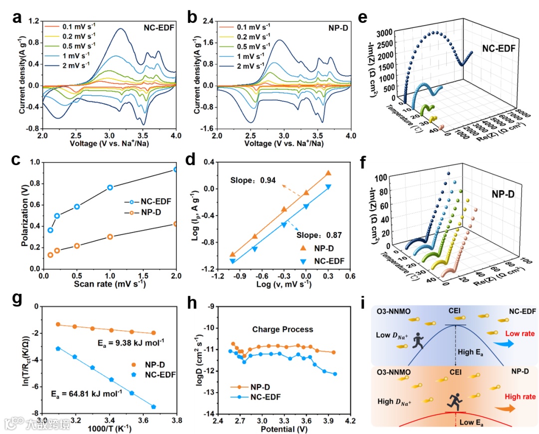 图4:电极过程动力学:(a) NC-EDF和 (b) NP-D在不同扫速下的循环伏安(CV)曲线图。(c) 在不同扫速下阳极和阴极峰之间的电位极化。(d) 在不同扫速下O3-NNMO的log(i)与log(v)图和b值。(e) NC-EDF和 (f) NP-D在0-40℃温度下经过10个循环后的阻抗变化Nyquist图。(g) RCEI电阻贡献的Arrhenius图和两个电解液中得到的活化能Ea。(h) 从GITT充电曲线计算的Na+扩散系数。(i) 阴极电解液界面上Na+传输动力学的示意图。