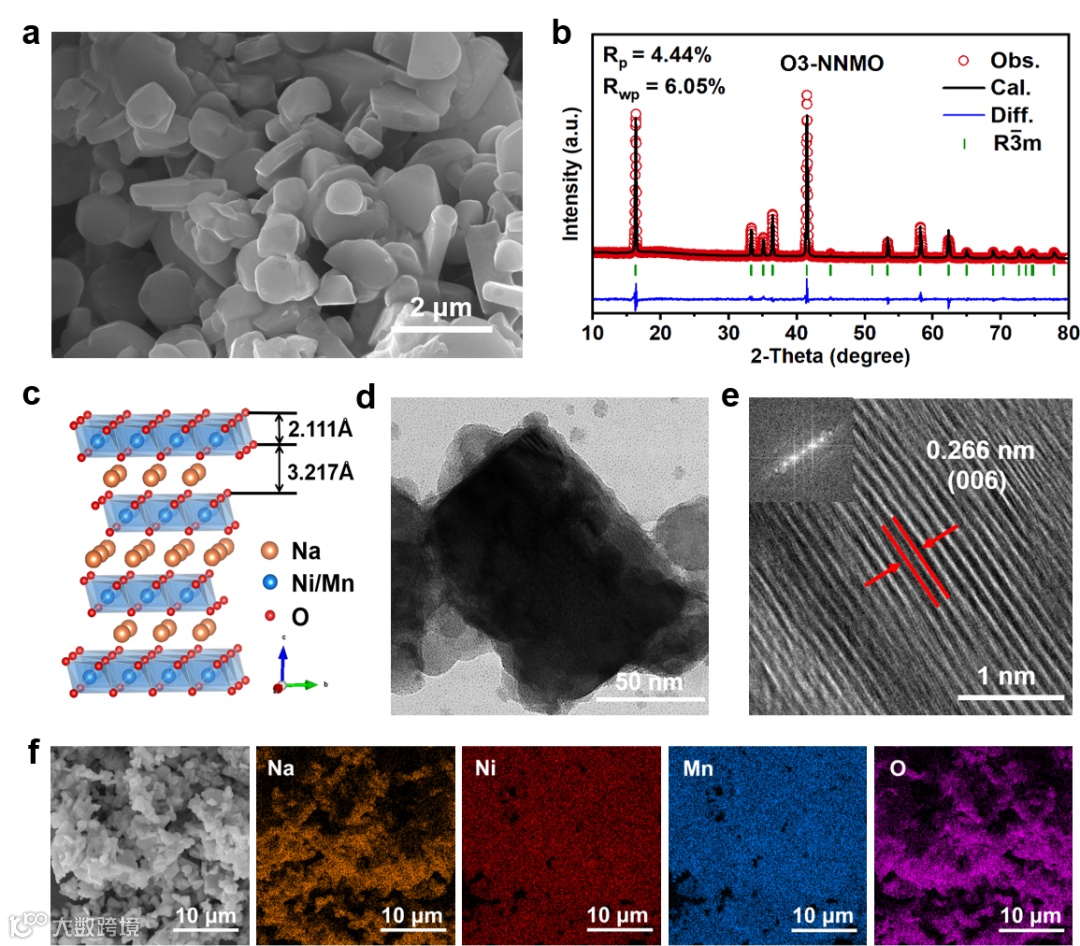 图2:O3-NNMO正极初始状态:(a) 扫描电子显微镜(SEM)图像,(b) XRD Rietveld精修图谱,(c) 晶体结构模型示意图,(d-e) 高分辨透射电子显微镜(HR-TEM)图像及快速傅里叶变换(FFT)图谱插入,以及 (f) O3-NNMO的能谱(EDS)映射。