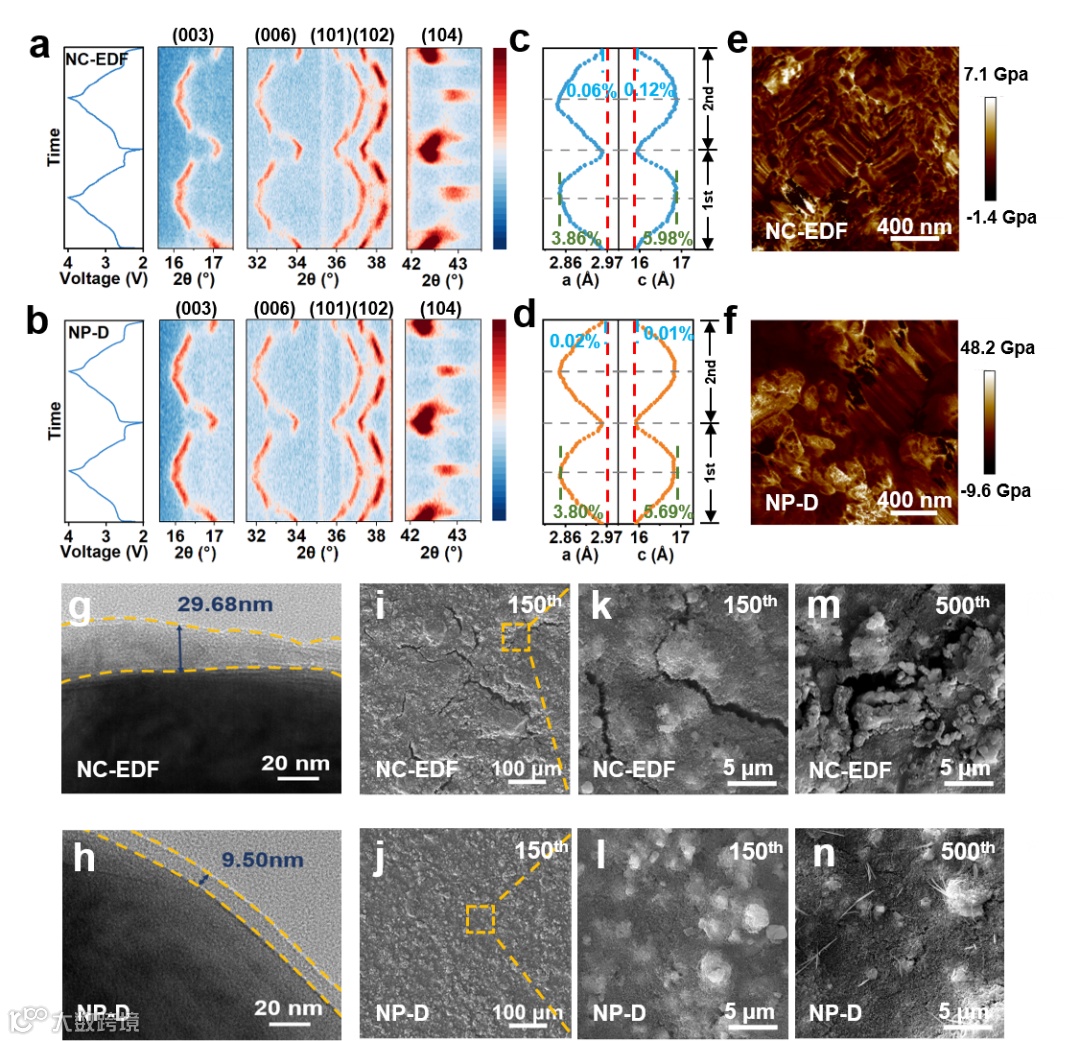 图5:O3-NNMO的结构演变和CEI的机械性能:(a) NC-EDF和 (b) NP-D样品的原位XRD图谱的等高线图和相应的充放电曲线。(c) NC-EDF和 (d) NP-D在充电和放电过程中a轴和c轴的长度变化。(e) NC-EDF和 (f) NP-D的CEI杨氏模量分析。(g) NC-EDF和 (h) NP-D经过10个循环后的CEI的HR-TEM图像,其中黄色虚线勾勒出CEI层。(i, k) 在NC-EDF和 (j, l) NP-D中循环150次后的O3-NNMO正极的扫描电子显微镜(SEM)图像。(m) NC-EDF和 (n) NP-D在1 C下循环500次后的O3-NNMO正极的SEM图像。