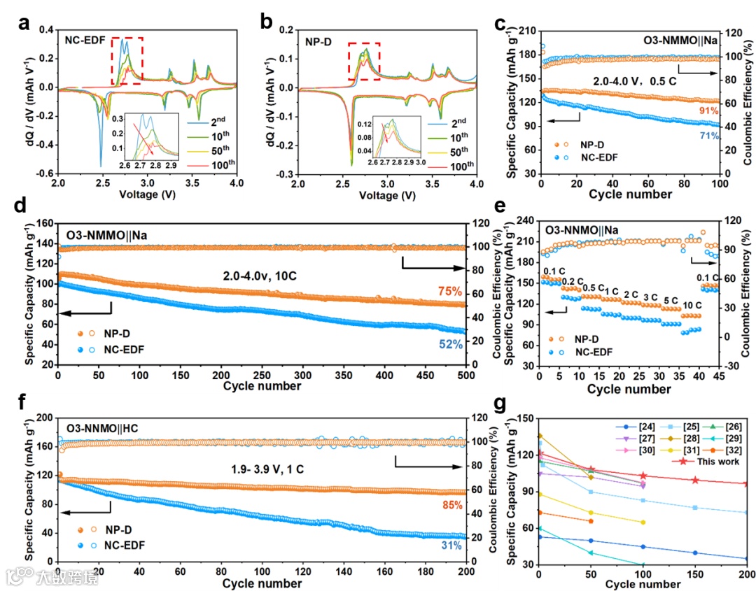 图3:O3-NNMO电池的电化学性能:(a) 使用NC-EDF和 (b) NP-D时的dQ dV−1曲线图,以及放大的差分容量峰插入图。(c) O3-NNMO||Na电池在2.0-4.0V电压范围内以0.5 C的倍率循环性能。(d) O3-NNMO||Na电池在2.0-4.0V电压范围内以10 C的倍率循环性能。(e) O3-NNMO||Na电池从0.1 C到10 C不同倍率下的倍率性能。(f) O3-NNMO||HC电池在1.9-3.9V电压范围内以1 C的倍率循环性能。(g) 与最近报道的具有层状氧化物正极的全电池SIBs的循环次数和比容量比较。