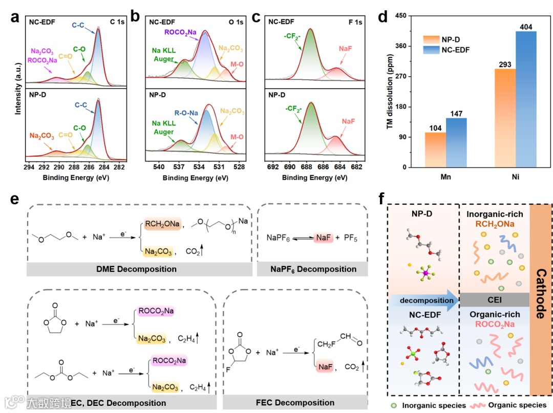 在用两种电解质进行50次循环后,对O3-NNMO阴极进行了XPS测试。C 1s光谱表明,NC-EDF样品的CEI有机物种中存在大量烷基碳酸钠(ROCO2Na)。它的存在显著破坏了表层薄膜的粘附性和内聚性,可能导致电化学性能下降。相比之下,在NP-D样品的CEI中,大多数有机化合物是醇钠(RCH2ONa),可以降低Na+扩散能垒。从O 1s光谱和F 1s光谱可以观察到, NP-D形成CEI的化学成分中无机成分的比例高于NC-EDF形成的化学成分。另外,NP-D电解质显著抑制了Ni和Mn从阴极的溶解,使其减少了近30%。
