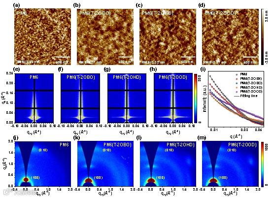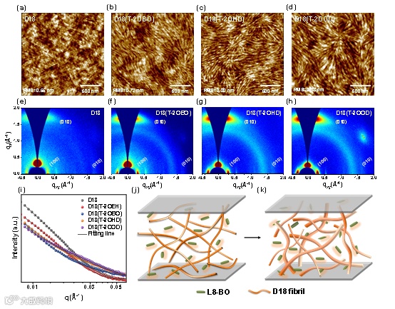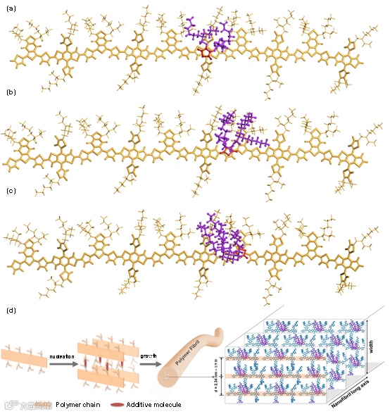 分子动力学模拟进一步表明,在成膜过程中,这些分子添加剂会优先定位在聚合物侧链附近,噻吩单元与共轭主链间产生-相互作用,同时长的烷基侧链会穿插在聚合物侧链间隙并与其缠结,增大共轭主链间相互作用,促进聚合物给体(PM6或D18等)分子链沿着(010)方向(对应纤维长度)和(100)方向(对应纤维直径)生长,最终形成长程有序的纤维结构。另外,添加剂的长侧链则产生体积效应,导致聚合物主链间的d-spacing增大,实现纳米纤维几何尺寸的调控。