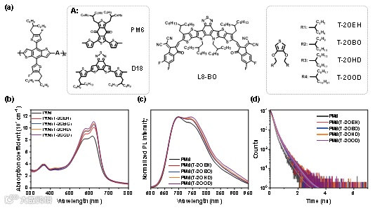 采用上述添加剂处理的聚合物作为电子给体,L8-BO为电子受体,结合逐层涂膜方法制备赝本体异质结有机太阳能电池,发现器件的激子扩散和解离能力、电荷传输和收集效率均有显著提高,最终在T-2OOD处理的D18/L8-BO p-BHJ OSCs中获得了20.1%的光电转换效率。