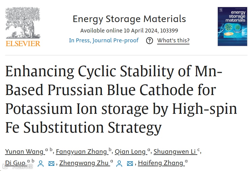 Yunan Wang, Fangyuan Zhang, Qian Long, Shuangwen Li, Di Guo, Zhengwang Zhu, Haifeng Zhang,Enhancing Cyclic Stability of Mn-Based Prussian Blue Cathode for Potassium Ion storage by High-spin Fe Substitution Strategy,Energy Storage Materials,