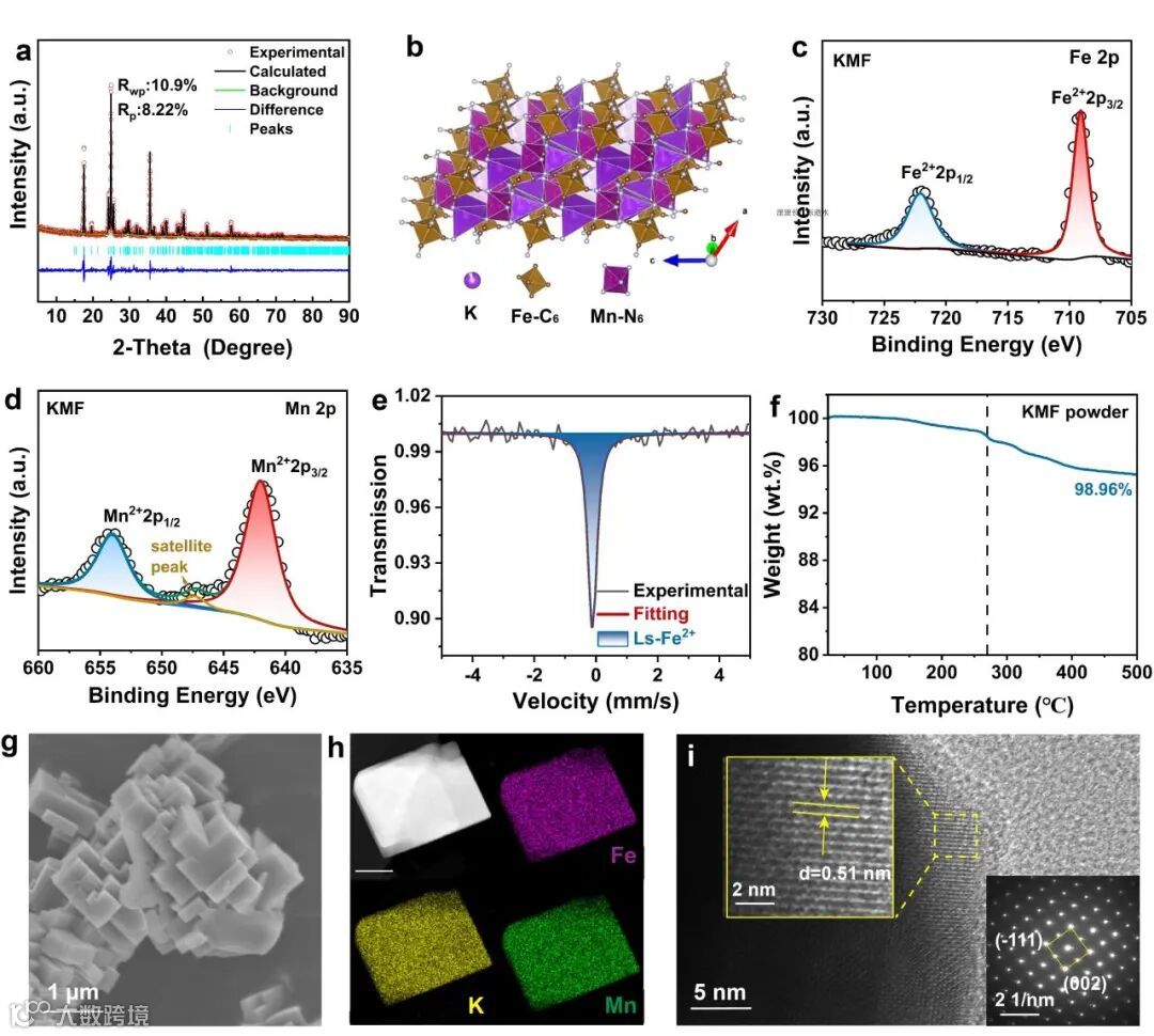 图1. 锰基普鲁士蓝KMF的形貌结构表征