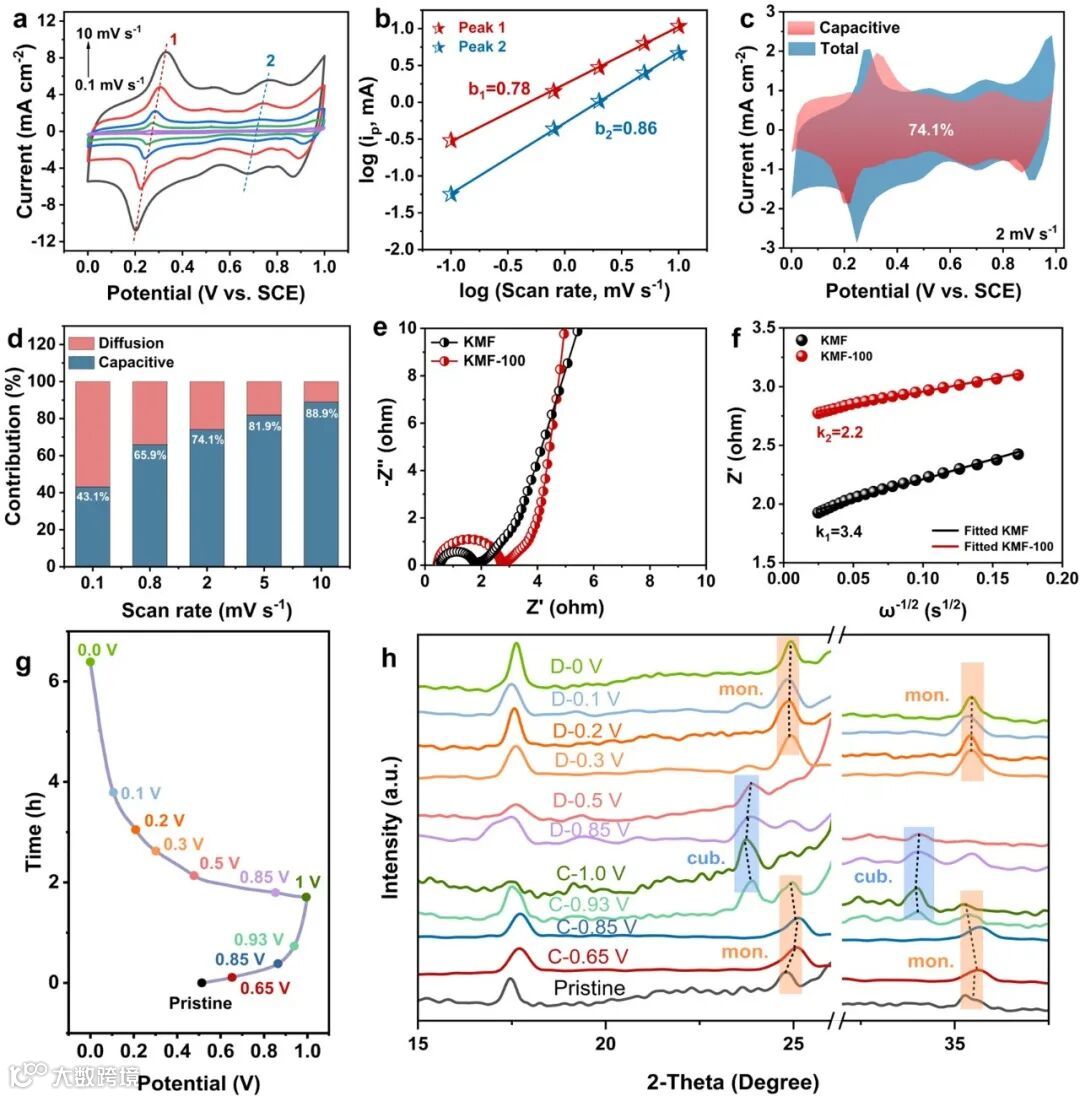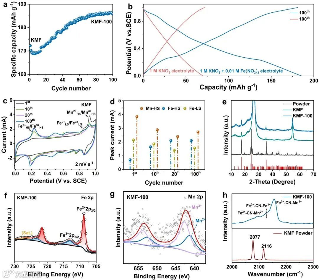 图3. 经混合电解液活化后获得高自旋铁取代的KMF-100电极性能测试及表征